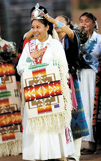 the events coronation ceremony on Saturday night. Im so surprised, Spencer said as a friend secured her silver crown on top of her head. Seriously, I cant believe I won ... Im going to cry. Spencer had little time to bask in her success, before she was ushered onto the arena as part of the dance performances grand entrance. Spencer is the daughter of Marjorie Jones, of Gallup, and is a member of the Navajo Tribe. The 2002 Gallup High School graduate is currently pursuing a degrees in political science and American Indian studies at Diné College. She plans to become a tribal advocate. During her reign as Miss Inter-tribal Indian Ceremonial, Spencer will promote self-motivation to young people regionwide. She is available for speeches and local events such as business openings, pageant coordinator Nancilee Howes said. Howes describes the queen as a goodwill ambassador for the Navajo Nation and surrounding areas and as a role model for young girls. The coronation was the culmination of a weeks worth of events. LaSasha Ross, Verrica Livingston, Emily Ellison and Spencer competed in the pageant in the areas of modeling traditional Native American regalia, public speaking, essay writing, modern talent, traditional or cultural talent and Southwest fashion demonstration. These are girls who studied to renew vows with their culture ..., Howes said. A panel of judges selected Ellison as the first-runner up who will assume Spencers title if she is unable to complete her responsibilities as queen. The nights festivities were bitter-sweet for outgoing Inter-tribal Indian Ceremonial Anna Ballenger who passed on her title to Spencer. I was presented with a wonderful opportunity in life when I was crowned Miss Inter-tribal Indian Ceremonial, Ballenger said to the crowd as she took her last steps as ceremonial royalty. Throughout her term as queen, Ballenger met with local preschoolers and attended a celebration in Window Rock for Navajo Code Talkers. Ballenger said shes learned an important lessen