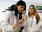 Chris Saucedo, right, and Josh Halona fill vials with gasoline Thursday
