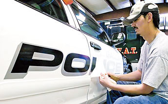 Ryan John, a graphics technician with Hinkley Signs, finishes applying