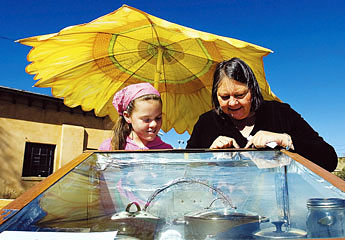 By Karen Francis GALLUP They waited nearly three hours, so when Jean Welles opened the solar oven to check on the food, several people gathered. Is it almost done? Genevieve Barriga asked as Welles opened the pot of jambalaya made with turkey sausage, shrimp, tomato sauce and herbs and spices. People were curious to find out how the food that was made in the solar oven tasted. Is it hot? Ingrid Patten asked Genevieve