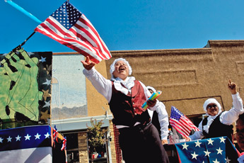 PARTY By Kevin Killough and Jim Tiffin Gallups Fourth of July Party in the Park celebration kicked off with the annual parade through downtown. Among those who participated in the parade were the Wingate High Rodeo team, the Lions Club, the Native Sky Hoop Dancers, various veterans group, and Senator John Pinto. Corral West had a founding fathers theme to their float. It featured greeters on the float dressed in colonial costumes, complete with white wigs. They were followed by the band Six o 2, which played live on their float. The Diné veterans float was a wooden