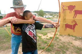 enough to attract some regular archers. The archery backstop, visible on N. First Street across from the church, is the brainchild of Scott, who approached the church last year for help in building a basic facility where kids could learn a skill and get together. The church provides the field and parking lot. Scott provides a lifetime of experience and the hand-made, semi-traditional bows students shoot in the classes. People are welcome to bring their own bows if they have them. Scotts bows are the old longbow style, with no recurve or mechanical parts. I am pretty low-tech, he said. Recurve bows are welcome at the frequent archery get-togethers, but no compound bows are allowed. Scott said he prefers traditional, human operated bows. Originally set up for young people from 2 to 18 years old, the irregular program is attracting parents, older learners and those returning to the sport as adults, along with the kids. Wednesday evening Grants resident Dustin Dean said he had been an active archer and taught for 4-H in the past, but had gotten away from the sport for a while. Now he seems to be back. Los Alamitos science teacher Chris Sarracino brought an additional target for last Wednesdays 7 p.m. to 8 p.m. session; Scott and the church provide hand made targets for the two shooting areas at the site. Archery is something anyone can do short, tall, fat. Football is skill dependent, Sarracino said and added that sports as athletic as football require a specific body type, but archery is individual. Sarracino, his wife Christine and two of their children, Mariah and Keaton, have been coming he said. Im not sure how we got involved. Were real glad Eds doing this. We come down on our own sometimes; every time (Scott) has it, we come, he said. Christine Sarracino teaches archery at Los Alamitos, using compound bows in the indoor class, but the family bow is the traditional long bow style. Son Keaton has stuck with the archery long enough for Sarracino to commission Scott to make a custom fitted bow for the boy. Lillian Andrews, 8, said she has come to archery lots of times and is pretty good. She said she likes the sport and will stick with it. Scott said the youngster is a regular and is getting pretty good. Some of the Wednesday archers come alone or hop across the street from the Lincoln Apartments on archery day. These kids can shoot, Sarracino observed after watching them over the months. Jordan Tatum ,youth minister at the Church of Christ, said the shoots get a lot of kids from the apartments in the summer, as well as kids taking part in the churchs youth activities, held after the Wednesday evening service. Tatum said the youth group also picks up kids from low-income apartments and brings them to the church for activities. Scott said he sometimes will take one of the bused kids home if they have permission from their parents to stay after the church bus leaves on the return trip. The First Street Irregulars do not have a steady practice and class time. Scott said that they have met the last few Wednesdays and will met next week, but he will have to see how things go when school starts. Parents want their kids in bed early for school, he noted. Information: Ed Scott (505) 287-8134. |