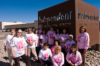 staff pose in their breast cancer awareness t-shirts Friday, October