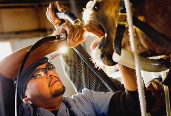 Upshaw, an equine dentist, works on the teeth of a horse at the