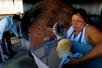 Baking the bread Copyright © 2008 ZUNI On any given week, tourists from around the world may knock at the front door of the Paywa home in Zuni Pueblo. Along with freshly baked Zuni bread, they are probably looking for something more a unique tourist stop, information about a centuries-old tradition, or a personal glimpse into a Native American home. They get all of those things when they stop by the Paywas house, where they can see the largest bread oven in Zuni Pueblo, they can learn about the Zuni tradition of bread making, and they can purchase bread, fruit pies, and turnovers from the family home. Family affair Paywas Zuni Bread is a family affair, run by siblings Jimmy Paywa and Rose Seeyouma and Jimmys daughter, Karlene Paywa. During a recent interview, the three sat down to talk about their unusual livelihood that brings customers from down the road and around the world. According to the family, the business was started in the 1970s by Jimmy and Roses parents, Bowman and Louise Paywa, who called it B&L Zuni Bread. Thirty years later, Jimmy, who once ran his own machine shop; Rose, who retired from a long career at the Leupp Boarding School; and Karlene, who used to work at the Gallup Head Start, are carrying on a family business rooted in Zuni tradition. Its a lot of hard work, but you get to meet a lot of people, Jimmy Paywa said. Three days a week the family members work from about 7 a.m. to 4 p.m., preparing and selling their bread, pies, and turnovers. Jimmy Paywa oversees the outdoor oven and everything that goes with it chopping the firewood, heating and cleaning the oven, loading and unloading the bread and pies. Seeyouma, a lifelong baker, oversees the kitchen work by preparing the dough, pie crusts, and fruit filling. Karlene Paywa helps both her father and her aunt by kneading and weighing dough, making turnovers, helping load and unload the oven, wrapping the baked items, and waiting on customers. On Saturday, Jimmy Paywa sells the baked goods at the Gallup Flea Market, while Seeyouma sells in front of the Zuni tribal building. On Sundays, Karlene Paywa and her husband haul more firewood for the next week. According to the family, they take two vacations a year during times of religious ceremonies in Zuni Pueblo. One work break is in June, they said, and the other is in December, right after Shalako. The rest of the year, the family sells about 180 loaves of traditional Zuni sourdough bread each week, along with 80 loaves of yeast bread and 24 loaves of raisin bread. The women fashion the sourdough and yeast bread into one of two styles: flip-over, where the dough is folded over like a taco, and fancy, where the dough is cut, which forms horn-like shapes. Seeyouma said the fancy style is the traditional Zuni bread style. Its always been made like that, Seeyouma said when asked about the unique shape. Zuni people call it bread with the horns, she said, while Navajo customers call it bear claw bread. In contrast, Seeyouma explained, the people of Acoma Pueblo shape their bread into big round loaves. We call them a big hamburger bun, she joked. The family also makes and sells about 16 fruit pies and nearly 100 turnovers each week. Seeyouma regularly mixes up apple, peach, cherry, and pineapple filling, and sometimes apricot and blueberry. Worldwide customers In addition to the attraction of freshly baked goods, many visitors to Paywas Zuni Bread stop by to see Jimmy Paywas huge bread oven, which sits inside a three-sided metal building. According to Jimmy Paywa, the average Zuni bread oven can hold about 30 loaves of bread, and his familys old oven could hold about 55 loaves. About a year ago, he said, he completed building the new oven, which can bake 100 loaves at one time. Because of the ovens size, the family was able to cut their work week down by one day. The beehive-shaped outdoor ovens, which were introduced into pueblo culture when the Spanish introduced wheat into the American Southwest, attract a lot of attention regardless of their size. According to the Paywa family, tourists who have some knowledge of Native American culture sometimes think the ovens are the Zuni version of a Navajo sweat lodge, while other tourists think the ovens are Zuni dog houses. Although amused by such comments, the family members said they enjoy meeting new visitors. Karlene Paywa said the family ends up in a lot of photographs taken by tourists and visiting school teachers. Two years ago, they also ended up in a rodeo television program after a film crew shooting a junior rodeo in Gallup took a side trip to Zuni and ended up at the Paywas house. Rodeo fans shopping at the Gallup Flea Market later told Jimmy Paywa they had seen the family on television. Some of their visitors keep in touch and send them postcards, letters, and even some gifts. A customer from Texas mailed the family gifts of jam and pecans, and a French woman sent them a postcard featuring a photograph of Frances famous bread crepes. But non-Indian tourists arent the only customers of Paywas Zuni Bread. Members of other tribes will frequently stop by, particularly Navajo families needing bread for family gatherings, weddings, and funerals. We even have Apache people clear from Arizona, said Seeyouma. Other Zuni people are also frequent customers. Not all Zuni families have their own bread ovens, the family members explained, and those who do have ovens dont necessarily bake their own bread on a regular basis. The Paywas and Seeyouma agreed that although the business involves a lot of work, it gives them time to spend together. Karlene Paywa explained that she grew up helping her grandparents when they ran B&L Zuni Bread, and she now enjoys working with her father and aunt. I guess it brings back memories of my grandparents, she said. Information: Paywas Zuni Bread at (505) 782-4849