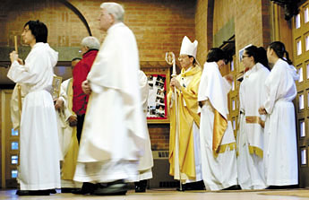 By Elizabeth Hardin-Burrola GALLUP After nearly six difficult months, the Diocese of Gallup began the New Year with a new bishop to shepherd the local church. The Most Rev. Thomas J. Olmsted, the newly appointed apostolic administrator of the Gallup Diocese, celebrated his first two public Masses in Gallups Sacred Heart Cathedral during well-attended services on Saturday evening and Sunday morning. He was greeted with applause when introduced, and many parishioners lined up to greet him after the services. On Thursday, Pope Benedict XVI appointed Olmsted, who is also the bishop of the Phoenix Diocese, to temporarily serve as the bishop of Gallup until either Donald E. Pelotte can return to his duties as bishop or until Pelottes successor is appointed and installed. Church authorities have granted Pelotte a one-year medical leave to allow him to try to recover from the serious injuries he sustained in his home on July 23, 2007. Olmsted tied examples from the weekends scripture readings to the Diocese of Gallups troubles since Pelotte was injured. Using the story of the Epiphany the discovery of the Christ Child by the three wise men who followed the star in the East Olmsted drew parallels to darkness and light, confusion and illumination, disappointment and hope, fear and faith. Both Pelotte and the Church have faced months of painful unknowns, admitted Olmsted. But just as Christians believe Christ is the light of the world, Olmsted said God brings light into the darkness of circumstances. With a reference to Romans 8:28, Olmsted reminded his audience that God can make all things including painful and confusing things, illness, disappointment, and even wrong things to work for good for those who love God. Regarding concerns about what may happen in the Diocese of Gallup in 2008, Olmsted also reminded the parishioners that Christ is with us and that his light shines forth and pierces the darkness. Repeating a scriptural reference he cited in his press conference on Thursday, Olmsted quoted the apostle Paul, If God is for us, who can be against us? Olmsted also asked his audience to continue to love Pelotte and to pray for him. Pelottes recovery was remembered in prayer in the general intercessions of the weekend Masses, something Olmsted has instructed the dioceses priests to include in all services. However, as the acting bishop of the Diocese of Gallup, Olmsteds name is now the bishops name being remembered in the Eucharistic Prayer in all the Masses celebrated across the diocese. Reporter Elizabeth Hardin-Burrola can be contacted at (505) 863-6811 ext. 218 or ehardinburrola@yahoo.com. |
