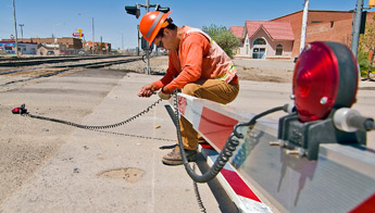 flashing lights to the top of a railroad crossing arm Tuesday morning